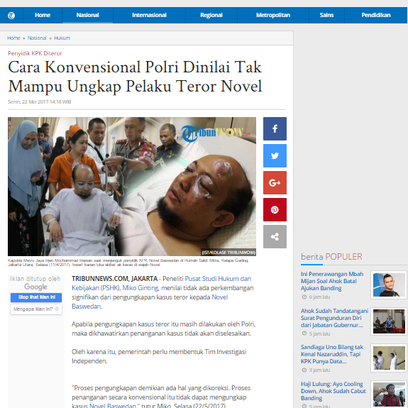 TRIBUNNEWS.COM, JAKARTA – Peneliti Pusat Studi Hukum dan Kebijakan (PSHK), Miko Ginting, menilai tidak ada perkembangan signifikan dari pengungkapan kasus teror kepada Novel Baswedan. Apabila pengungkapan kasus teror itu masih dilakukan oleh Polri, maka dikhawatirkan penanganan kasus tidak akan diselesaikan. Oleh karena itu, pemerintah perlu membentuk Tim Investigasi Independen. “Proses pengungkapan demikian ada hal yang…