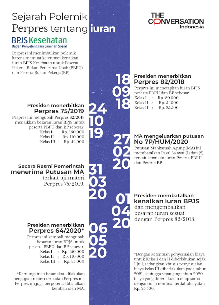 Pasalnya, Jokowi tetap menaikkan iuran anggota BPJS meski aturan yang melandasi kenaikan itu sudah dibatalkan oleh Mahkamah Agung (MA) melalui putusan Nomor 7P/HUM/2020 tertanggal 27 Februari 2020. Kurang dari tiga bulan, tepatnya 6 Mei 2020, Jokowi malah menerbitkan Peraturan Presiden (Perpres) Nomor 64 Tahun 2020 tentang kenaikan iuran BPJS.