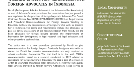 Peradi (Perhimpunan Advokat Indonesia / the Indonesian Bar Association) as one of Indonesia’s most prominent bar associations has just passed a new regulation for the practices of foreign lawyers in Indonesia. The Peradi Chairman Decree No. KEP.2010/PERADI/DPN.XII/2013 on Requirements and Procedural Recommendations for Foreign Lawyers Working in Indonesia outlines key requirements of foreigners who wish to practice law in Indonesia. The terms and requirements include the obligation to pass an ethics test as part of the recommendation from Peradi, the pro bono obligation for foreign lawyers towards the improvement of Indonesian law development in legal research and legal education, and other procedural technicalities.