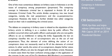 The debate on conspiracy in bribery cases is related to the stipulation of the bribery article in defining it as a conduct done by public officers. The problem occurred when such public officers used people who are non-public officers to act as middlemen in taking the bribe. Supposedly, the law on conspiracy classifies the act of co-conspirators also as the act of real perpetrators. Thus, the element of crime defining the action of co-conspirators does not necessarily need to fill all the elements of criminal actions. In other words, the action of co-conspirators, despite his/her status as non-public officers, can also be charged with the bribery article. However, in recent cases there has been confusion among judges in the application of the concept. In the case of Susi Tur Handayani, Akil Mochtar’s co-conspirator, all judges refused to apply the article on judge bribery because Susi Tur Handayani is not a judge. This reason is not necessarily correct, because based on the conspiracy concept, the act of Susi Tur Handayani was on behalf of Akil. Thus, the article of receiving bribery as a judge can also be charged.