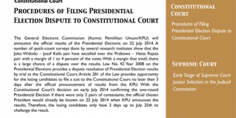 The General Elections Commission (Komisi Pemilihan Umum/KPU) will announce the official results of the Presidential Elections on 22 July 2014. A number of quick-count surveys done by several research institutes show that the Joko Widodo – Jusuf Kalla pair have excelledover the Prabowo – Hatta Rajasa pair with a margin of 1 to 4 percent of the votes. With a margin that small, there is a large chance of a dispute over the results. Law No. 42 Year 2008 on the Presidential Elections provides a dispute resolution of Presidential Election results by trial at the Constitutional Court. Article 201 of the Law provides opportunity for the losing candidates to file a suit to the Constitutional Court no later than 3 days after the officialannouncement of results from the KPU. With the Constitutional Court’s decision on early July 2014 confirming the one-round Presidential Election if there were only 2 pairs of contestants, the official chosen President would already be known on 22 July 2014 when KPU announces the results. Therefore, the losing candidates only have 3 days up to July 25th to challenge the result.