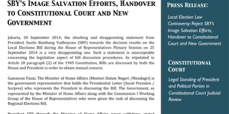 Bent by pressure from the public and to safeguard his image, President Susilo Bambang Yudhoyono and the political party coalition who supported Jokowi haveexpressed their intention in petitioning the validity of the law to the Constitutional Court. Such intention is baseless and perplexing. From the President’s side, the Local Elections Law is passed by his acknowledgment and control. The Ministry of Home Affairs is his aide in government, who was also present in the deliberation andenactment of the law. Additionally, his Democrat Party is the largest political power in Parliament. The enactment of the law can be considered as a failure by SBY to uphold his political aspiration amongst his aide and politicians in his party. Furthermore, by law, the Political Party does not have legal standing based on several Constitutional Court decisions, including the newest Constitutional Court decision on the Law on the People’s Consultative Assembly, House of Representatives, House of Regional Representatives, and Regional House of Representatives (Undang-Undang MPR, DPR, DPD, dan DPRD /UU MD3). The reason for the rejection is based on the rationale that the political party had their chance during the discussions in the law making process. Therefore, the rights of political parties to petition the law has abolished. Considering the argument, it is logical to apply the rationale to evaluate the President’s (read: the Government’s) position as one of the parties already involved in debating the law making process. (GAT)
