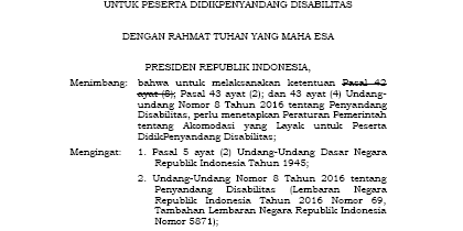 Pemerintah sudah mengagendakan untuk membentuk 8 Rancangan Peraturan Pemerintah (RPP) sebagai pelaksanaan Undang-undang Nomor 8 tahun 2016. 5 RPP diantaranya sudah masuk sebagai RPP prioritas di 2018, melalui Keputusan Presiden Nomor 20 Tahun 2018 tentang program Penyusunan Peraturan Pemerintah 2018. Salah satu RPP yang masuk dalam prioritas 2018 adalah Rancangan Peraturan Pemerintah Akomodasi yang Layak untuk Peserta Didik Penyandang Disabilitas yang diinisiasi oleh Kementerian Pendidikan dan Kebudayaan Republik Indonesia. Proses pembentukannya saat ini baru masuk dalam tahap persiapan, yang selanjutnya akan dibahas dalam internal Pemerintah dengan melibatkan berbagai Kementerian/Lembaga terkait. Berikut draft RPP versi terbaru dari Kementerian Pendidikan dan Kebudayaan tentang Akomodasi yang Layak untuk Peserta Didik Penyandang Disabilitas.