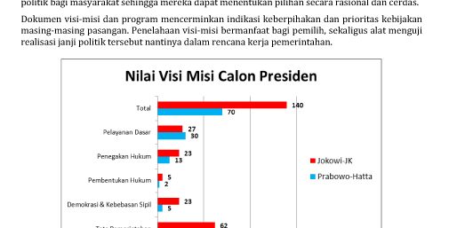 Dokumen visi-misi dan program mencerminkan indikasi keberpihakan dan prioritas kebijakan masing-masing pasangan. Penelahaan visi-misi bermanfaat bagi pemilih, sekaligus alat menguji realisasi janji politik tersebut nantinya dalam rencana kerja pemerintahan.