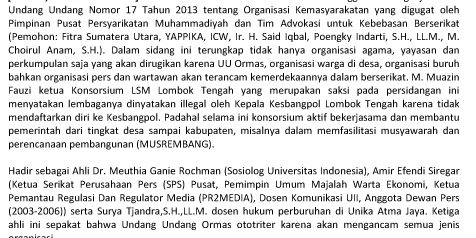 [Jakarta, 11 Februari 2014] Mahkamah konstitusi hari ini kembali menggelar sidang uji materi Undang Undang Nomor 17 Tahun 2013 tentang Organisasi Kemasyarakatan yang digugat oleh Pimpinan Pusat Persyarikatan Muhammadiyah dan Tim Advokasi untuk Kebebasan Berserikat (Pemohon: Fitra Sumatera Utara, YAPPIKA, ICW, Ir. H. Said Iqbal, Poengky Indarti, S.H., LL.M., M. Choirul Anam, S.H.). Dalam sidang ini terungkap tidak hanya organisasi agama, yayasan dan perkumpulan saja yang akan dirugikan karena UU Ormas, organisasi warga di desa, organisasi buruh bahkan organisasi pers dan wartawan akan terancam kemerdekaannya dalam berserikat. M. Muazin Fauzi ketua Konsorsium LSM Lombok Tengah yang merupakan saksi pada persidangan ini menyatakan lembaganya dinyatakan illegal oleh Kepala Kesbangpol Lombok Tengah karena tidak mendaftarkan diri ke Kesbangpol. Padahal selama ini konsorsium aktif bekerjasama dan membantu pemerintah dari tingkat desa sampai kabupaten, misalnya dalam memfasilitasi musyawarah dan perencanaan pembangunan (MUSREMBANG).