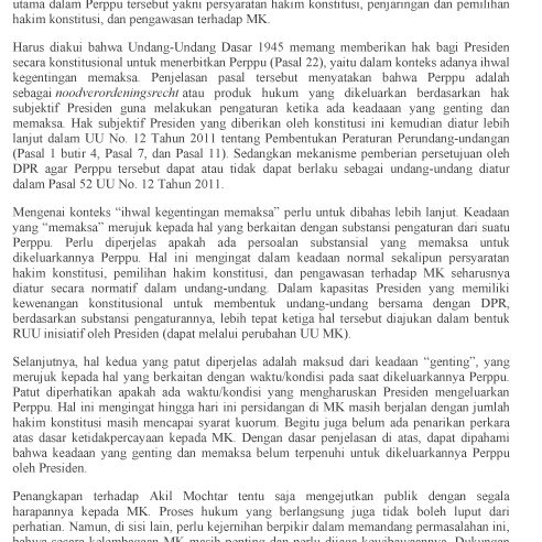 Harus diakui bahwa Undang-Undang Dasar 1945 memang memberikan hak bagi Presiden secara konstitusional untuk menerbitkan Perppu (Pasal 22), yaitu dalam konteks adanya ihwal kegentingan memaksa.