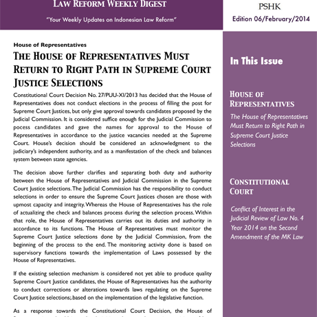 House of Representatives The House of Representatives Must Return to Right Path in Supreme Court Justice Selections Constitutional Court Decision No. 27/PUU-XI/2013 has decided that the House of Representatives does not conduct elections in the process of filling the post for Supreme Court Justices, but only give approval towards candidates proposed by the Judicial Commission.…