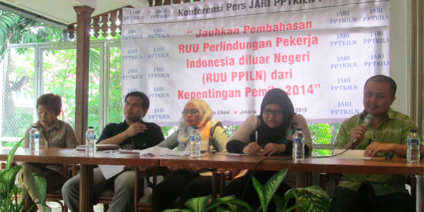 Konferensi pers tersebut dihadiri oleh tiga orang narasumber lain; Arya Budi (Pengamat Politik Pol-Track Institute), Erna Murniaty (Ketua Serikat Buruh Migran Indonesia/SBMI), dan Nurus S. Mufidah (Koordinator JARI PPTKLN). Dimoderatori oleh Dinda Nuranisa Yura (Solidaritas Perempuan), tema yang diangkat adalah “Jauhkan Pembahasan RUU Perlindungan Pekerja Indonesia di Luar Negeri (RUU PPILN) dari Kepentingan Pemilu 2014”. Pembahasan RUU PPILN sudah lima kali dilakukan sejak 26 Februari 2013, tetapi revisi itu hanya berkutat seputar judul. Sementara itu, Pemilu 2014 semakin dekat dan anggota DPR sudah mulai beralih fokus pada pemenangan pemilihan mereka masing-masing. Dikhawatirkan, apabila dipaksakan, pengesahan RUU itu akan mengakibatkan undang-undang yang prematur.