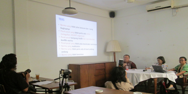 Ronald lalu melanjutkan dengan menjelaskan bacaan tekstual yang berdasar pada naskah UU No. 17 Tahun 2013 tentang Organisasi Kemasyarakatan. “Dari 87 pasal, hanya 48 yang kami nilai terkait dengan pengaturan ormas. Selebihnya sudah diatur dalam konstitusi, KUHP, KUHAP,dan yang lainnya.” Ia bahkan mengatakan bahwa 48 pasal itu bersifat administrative dan tidak perlu ada pada level undang-undang. “Ketidakhadiran pasal-pasal itu tidak akan mempengaruhi ruanggerak dan keberadaan Ormas.” Ia pun mengkategorisasi tujuh “penyakit umum” dalam undang-undang di Indonesia dan menekankan pada salah satunya, yaitu “norma yang multitafsir” yang rawan untuk disalahgunakan. Pembahasan itu mengajak kita melihat kembali kerancuan definisi ormas itu sendiri, yang akhirnya akan mengancam kebebasan berserikat dan berkumpul. (AW)