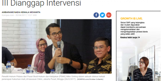 JAKARTA, KOMPAS.com – Peneliti Pusat Studi Hukum dan Kebijakan Miko Susanto Ginting menganggap digulirkannya hak angket untuk meminta Komisi Pemberantasan Korupsi (KPK) membuka rekaman pemeriksaan mantan Anggota Komisi II DPR Miryam S Haryani, merupakan intervensi terhadap proses penegakan hukum.