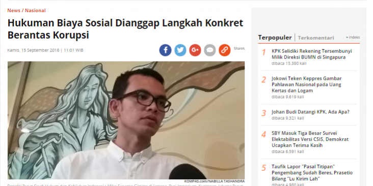 Tautan online: http://nasional.kompas.com/read/2016/09/15/11011681/hukuman.biaya.sosial.dianggap.langkah.konkret.berantas.korupsi