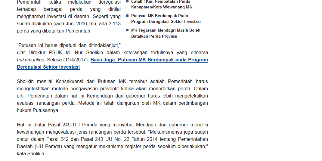 Pusat Studi Hukum dan Kebijakan Indonesia (PSHK) meminta Pemerintah cq Kemendagri untuk melaksanakan putusan MK No 137/PUU-XIII/2015 terkait penghapusan norma wewenang pembatalan peraturan daerah (perda) kabupaten/kota oleh Mendagri. Sebab, putusan itu berpengaruh hilangnya “jalan pintas” Pemerintah ketika melakukan deregulasi terhadap berbagai perda yang dinilai menghambat investasi di daerah. Seperti yang sudah dilakukan pada Juni 2016 lalu, ada 3.143 perda yang dibatalkan Pemerintah.