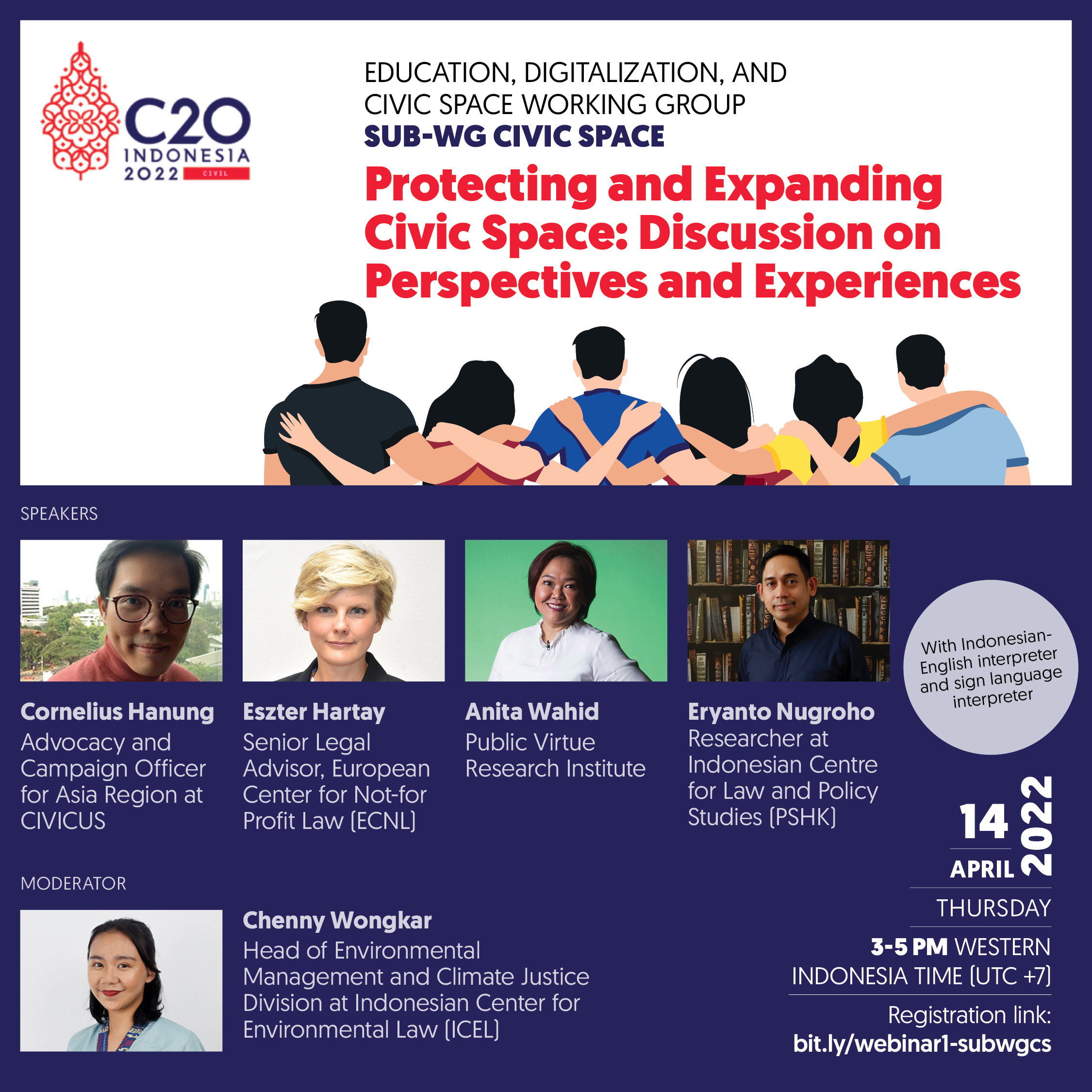 As a brief summary: the first speaker, Cornelius Hanung from CIVICUS (South Africa), elaborated on the latest monitoring on global situation, including the recent trend of shrinking civic space in Asia region in which he is in charge of as an advocacy and campaign officer. Next, Eszter Hartay from European Center for Not-for Profit Law (ECNL) (Netherlands) as the second speaker highlighted the phenomena of ‘rule by law’, in contrast to rule of law, to be among the causes of global civic space crisis. Anita Wahid, researcher from Public Virtue Research Institute (Indonesia) shared her insight on hoax or disinformation issues and its implication on civic freedom, resulting in a highly polarised society. At last, Eryanto Nugroho from Center for Law and Policy Studies (Indonesia) presented a list of priority issues of the Civic Space C20 Sub-Working Group, and what kind of policy action the G20 leaders should take to expand the civic space. The C20 forum serves as a strategic opportunity for the civil society to demand the G20 leaders to make a policy towards safe and expanded civic space as well as meaningful and inclusive participation.