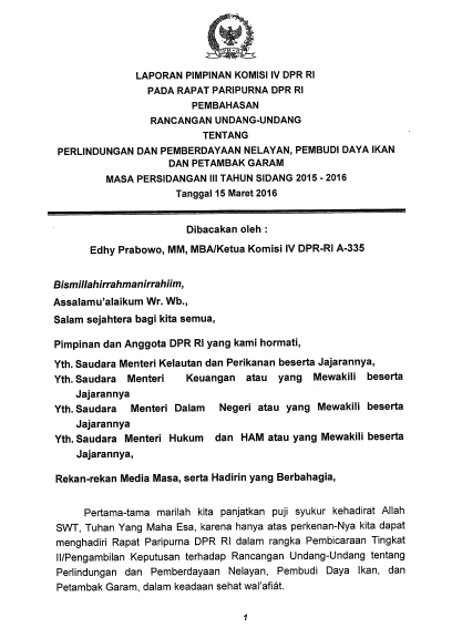 Mar162016 Laporan Komisi IV pada Rapat Paripurna Pembahasan Rancangan Undang-Undang tentang Perlindungan dan Pemberdayaan Nelayan, Pembudi Daya Ikan, dan Petambak Garam Info Legislasi, PublikasiBy PSHK16/03/2016 3:44 PM Details