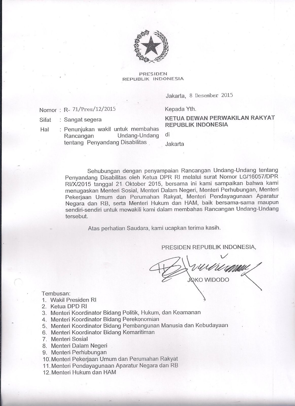 Jan262016 Surat Presiden untuk Pembahasan Rancangan Undang-Undang tentang Penyandang Disabilitas Info Legislasi, PublikasiBy PSHK26/01/2016 10:44 AM Details