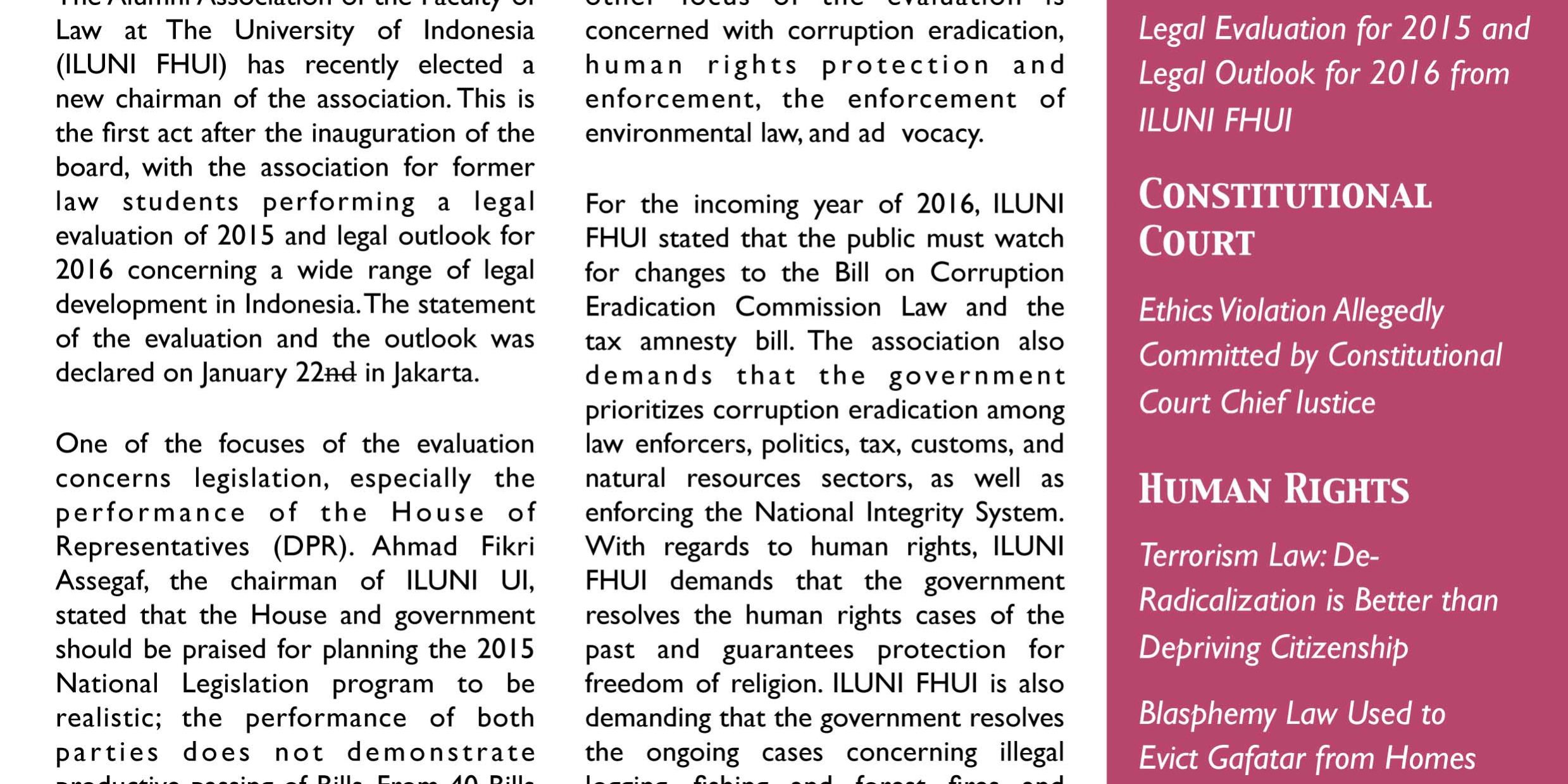 For the incoming year of 2016, ILUNI FHUI stated that the public must watch for changes to the Bill on Corruption Eradication Commission Law and the tax amnesty bill. The association also demands that the government prioritizes corruption eradication among law enforcers, politics, tax, customs, and natural resources sectors, as well as enforcing the National Integrity System. With regards to human rights, ILUNI FHUI demands that the government resolves the human rights cases of the past and guarantees protection for freedom of religion. ILUNI FHUI is also demanding that the government resolves the ongoing cases concerning illegal logging, fishing and forest fires and enforces the land reform program. Lastly, ILUNI FHUI stated that ideally, advocacy will be best served by a single organization. However, when this is not achievable, a single standard for recruitment and education with a single relevant ethics code for all advocacy organisations and consistent supervision. (KFL)