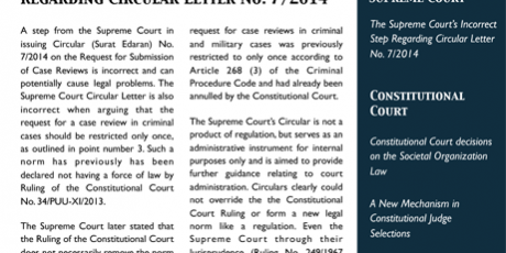 The Supreme Court’s Circular is not a product of regulation, but serves as an administrative instrument for internal purposes only and is aimed to provide further guidance relating to court administration. Circulars clearly could not override the the Constitutional Court Ruling or form a new legal norm like a regulation. Even the Supreme Court through their Jurisprudence (Ruling No. 249/1967 P.T Perdata and Ruling No. 105k/sip/1968) stated that Circulars could not override a norm of a law (regulation). Circular No. 7 Year 2014 could potentially cause legal problems for the Court, law enforcement officials, and justice seekers. Therefore, the Supreme Court should revise the Circular immediately for the sake of certainty and justice of the law. (MSG)