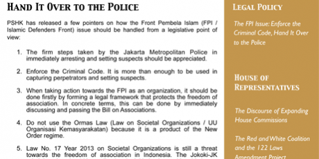 PSHK has released a few pointers on how the Front Pembela Islam (FPI / Islamic Defenders Front) issue should be handled from a legislative point of view: