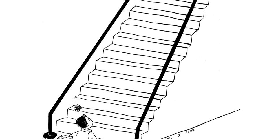 Dalam ilustrasi itu, seseorang berkursiroda sedang ada di tangga bagian paling bawah. Di depan tangga itu, ada keset yang mungkin bertuliskan, “Welcome”. Di ujung tangga paling atas, ada satu papan penunjuk arah.Di papan itu, ada tulisan, “Lowongan kerja” dengan tanda panah kekanan.