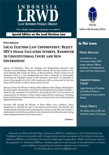Special Edition on the Local Elections Law Press Release: Local Election Law Controversy: Reject SBY’s Image Salvation Efforts, Handover to Constitutional Court and New Government Jakarta, 30 September 2014; the shocking and disappointing statement from President Susilo Bambang Yudhoyono (SBY) towards the decision results on the Local Elections Bill during the House of…