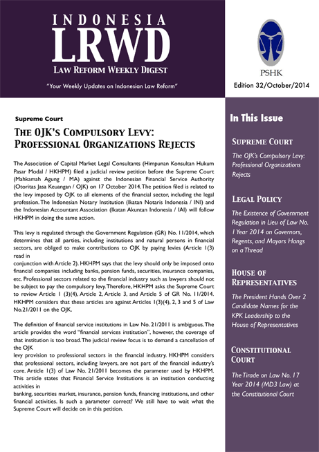 Supreme Court The OJK’s Compulsory Levy: Professional Organizations Rejects The Association of Capital Market Legal Consultants (Himpunan Konsultan Hukum Pasar Modal / HKHPM) filed a judicial review petition before the Supreme Court (Mahkamah Agung / MA) against the Indonesian Financial Service Authority (Otoritas Jasa Keuangan / OJK) on 17 October 2014. The petition filed is…