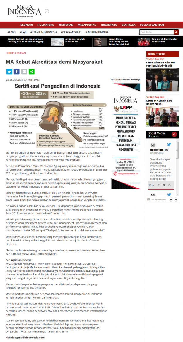 Akreditasi Penjaminan Mutu merupakan salah satu program unggulan dari Direktorat Jenderal Badan Peradilan Umum (Badilum). Tim akreditasi internal ini dibentuk untuk melakukan penilaian dan penjaminan mutu pada pengadilan negeri dan pengadilan tinggi di seluruh Indoensia sesuai standar sertifikasi ISO:2015. Selain itu, ikut dikuatkan dengan penerapan International Framework for Court Excellent (IFCE), Pelaksanaan Reformasi Birokrasi, standar…