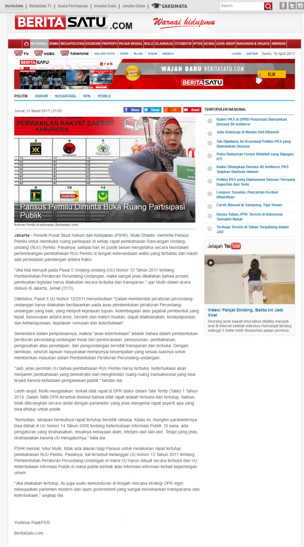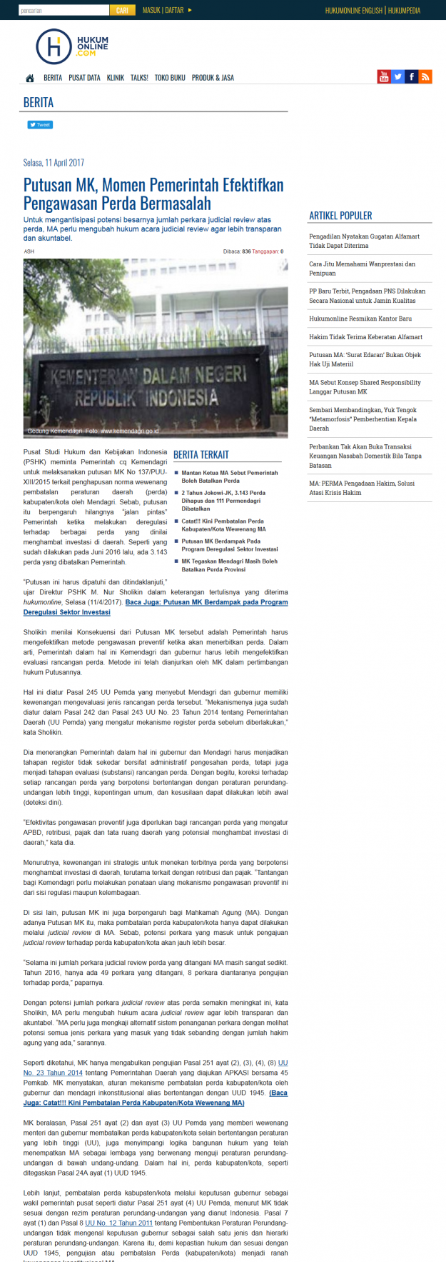 Untuk mengantisipasi potensi besarnya jumlah perkara judicial review atas perda, MA perlu mengubah hukum acara judicial review agar lebih transparan dan akuntabel. Pusat Studi Hukum dan Kebijakan Indonesia (PSHK) meminta Pemerintah cq Kemendagri untuk melaksanakan putusan MK No 137/PUU-XIII/2015 terkait penghapusan norma wewenang pembatalan peraturan daerah (perda) kabupaten/kota oleh Mendagri. Sebab, putusan itu berpengaruh hilangnya…