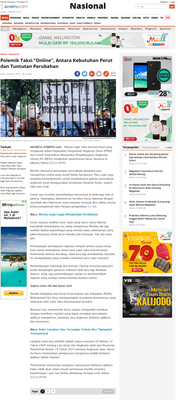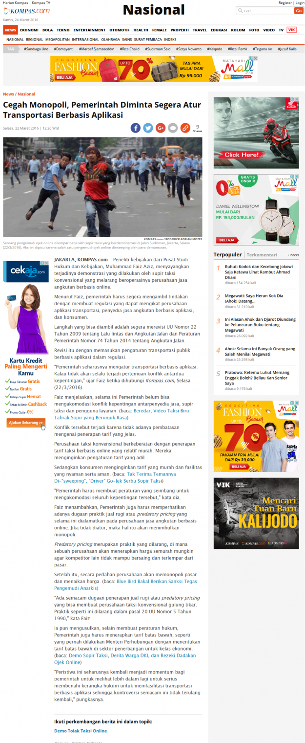 JAKARTA, KOMPAS.com – Peneliti kebijakan dari Pusat Studi Hukum dan Kebijakan, Muhammad Faiz Aziz, menyayangkan terjadinya demonstrasi yang dilakukan oleh supir taksi konvensional yang melarang beroperasinya perusahaan jasa angkutan berbasis online. Menurut Faiz, pemerintah harus segera mengambil tindakan dengan membuat regulasi yang dapat mengikat perusahaan aplikasi transportasi, penyedia jasa angkutan berbasis aplikasi, dan konsumen. Langkah…