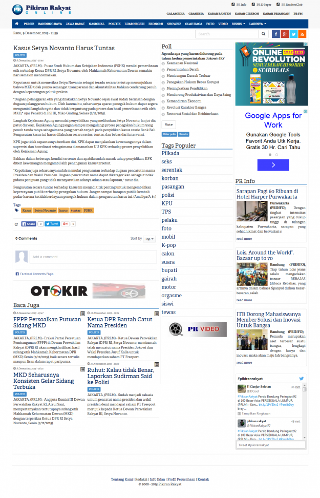 REPUBLIKA.CO.ID, JAKARTA — Peneliti Pusat Studi Hukum dan Kebijakan (PSHK) Ronald Rofiandri mengatakan Mahkamah Kehormatan Dewan (MKD) tidak membangun preseden, yurisprudensi melalui putusannya. MKD dinilai tidak melakukan penuntasan terhadap setiap kasus Setya Novanto. “Dua dugaan MKD tidak menangani presenden penangan secara tuntas,” ujar Ronald di kantor ICW, Jakarta, Selasa (22/12). MKD tidak menjelaskan bagaimana prilaku…