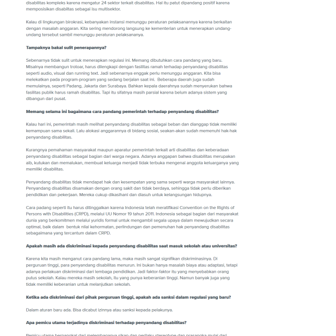 Deskripsi ini dibuat tanpa bermaksud untuk membatasi makna, tetapi untuk bisa tetap diakses oleh semua orang yang punya kemampuan berbeda. Pusat Studi Hukum dan Kebijakan Indonesia atau yang biasa disebut dengan PSHK menyajikan infografik dengan judul Bergerak Bersama Disabilitas. Tulisan itu disandingkan dengan sebuah ilustasi seseorang yang sedang duduk di kursi roda sambil tersenyum. Ada…